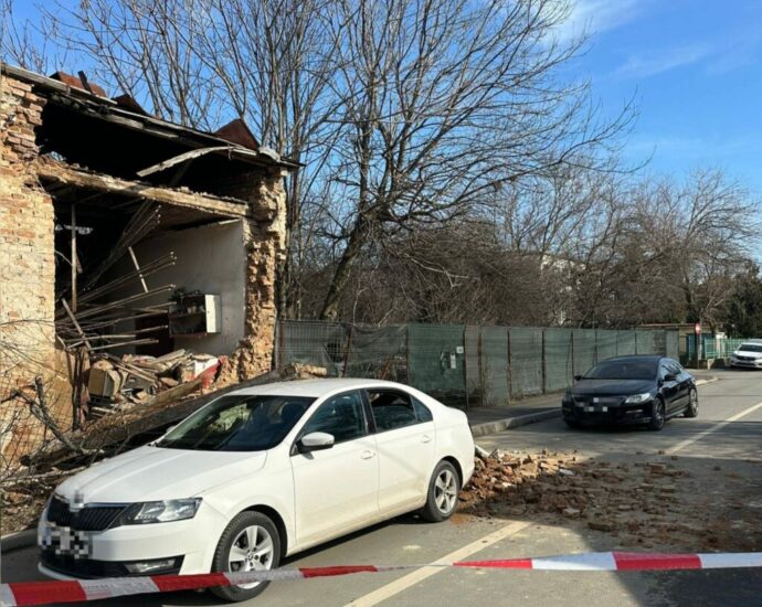 Peretele unei clădiri dezafectate s-a prăbușit peste o mașină, în apropierea liceului Tudor Vianu