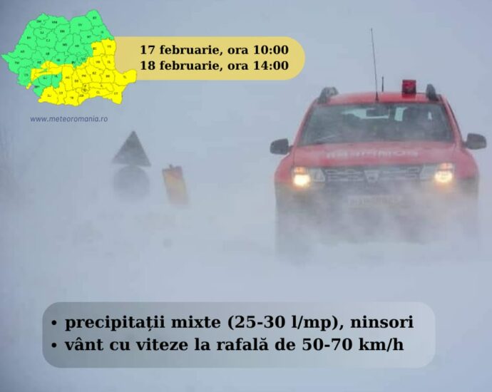Meteorologii au emis un cod galben de precipitații însemnate cantitativ, strat de zăpadă, intensificări ale vântului și viscol. Acesta este valabil în intervalul 17 februarie, ora 10:00 – 18 februarie, ora 14:00. Ziua vor fi precipitații mixte, iar noaptea vor predomina ninsorile. Se vor acumula cantități de precipitații de 25-30Citeste pe larg