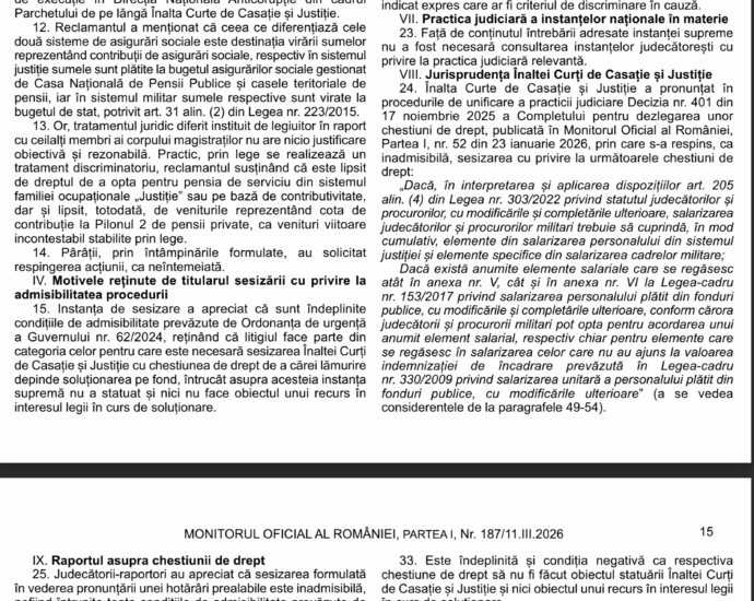 Un procuror militar solicită instanțelor să-l scoată din sistemul pensiilor militare pentru a nu fi discriminat față de magistrații civili in stabilirea drepturilor de pensie