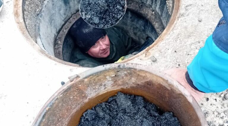 Imagini șocante de la un cămin canalizare colmatat cu asfalt pietrificat în urma asfaltării străzii.