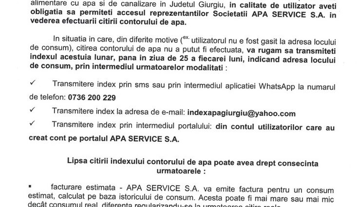 APA SERVICE – atenționare pentru abonați: aveți obligația de a permite citirea contorului de apă!