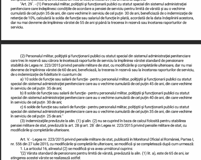 Pentru remedierea tâmpeniei care durează de 11 ani, cu consecința plecării specialiștilor din instituțiile militare prin pensionare anticipată, Guvernul a prevăzut prin OUG nr. 7/2026, intrată in vigoare pe 24 februarie 2026, adoptarea in termen de 30 de zile a unui act normativ de modificare și completare a legii pensiilor militare, intitulat generic act de reformă a pensiilor militare.