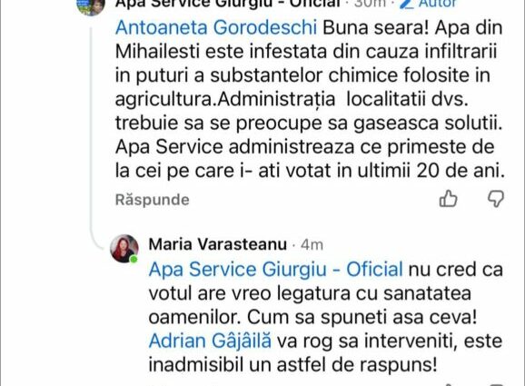 Pornind de la acest subiect, primarul orașului Mihăilești a postat, joi seara, un apel către conducerea Apa Service, atrâgând atenția nu asupra problemei în sine, cât a atitudinii comunicatorilor societății, care au dat răspunsuri cel puțin nepotrivite unor întrebări legitime ale locuitorilor din Mihăilești.