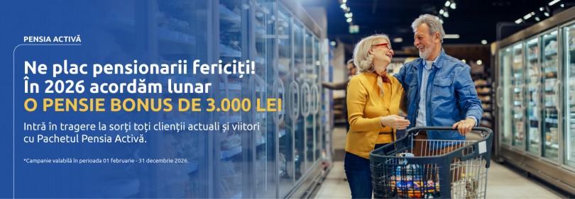 Pe parcursul întregului an, banca va acorda un premiu lunar constând într-o pensie suplimentară, în valoare de 3.000 de lei, clienților care dețin sau achiziționează pachetul de cont Pensia Activă în perioada 02 februarie – 31 decembrie 2026. La tragerea la sorți lunară vor fi incluși automat toți clienții care au încasat pensia de la casele de pensii în luna precedentă, ultima tragere la sorți fiind programată pentru 15 decembrie 2026.