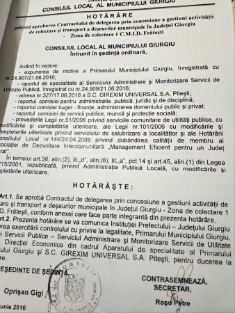 În data de 20 iunie 2016, era semnat contractul nr. 26.066 între Girexim Universal SA și Primăria Municipiului Giurgiu. Prin acest document, asumat de ambele părți, Primăria se obliga să plătească lunar suma de 6,2 lei plus TVA per persoană.
