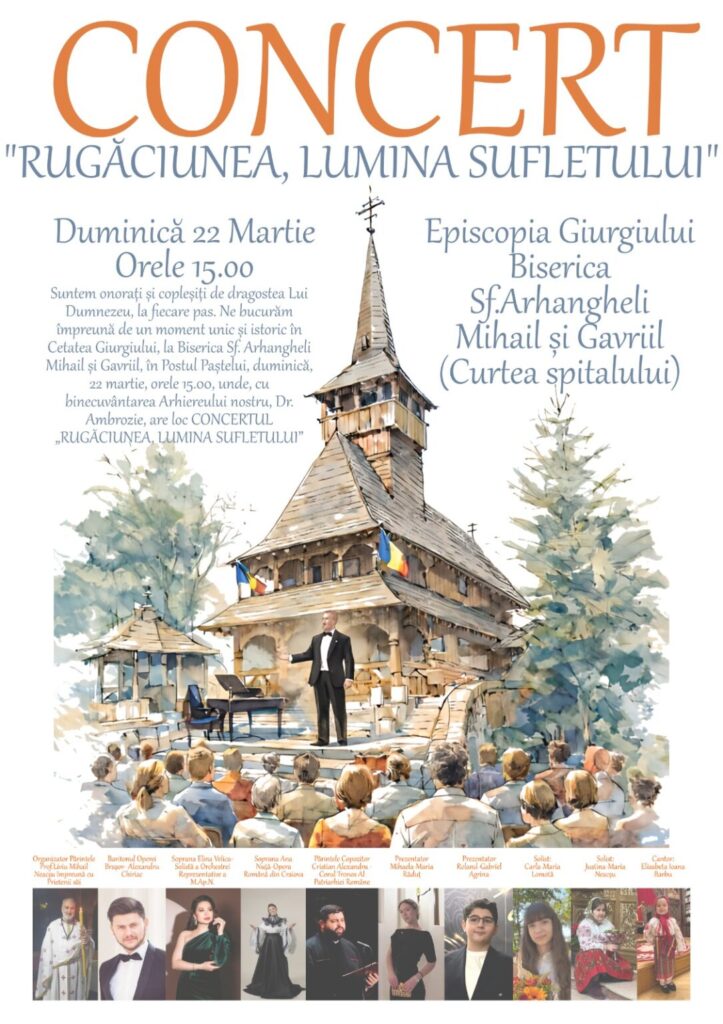 În atmosfera profundă și binecuvântată a Postului Paștelui, credincioșii din Giurgiu sunt invitați să trăiască un moment cu adevărat special: concertul spiritual „Rugăciunea, Lumina Sufletului”, un eveniment de excepție care va avea loc duminică, 22 martie, de la ora 15.00, la Biserica Sf. Arhangheli Mihail și Gavriil, din curtea Spitalului JudeţeanCiteste pe larg