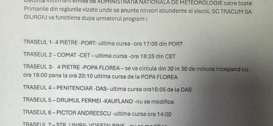 În altă ordine de idei, același cod portocaliu determină și modificarea programului mijloacelor de transport în comun din municipiu: