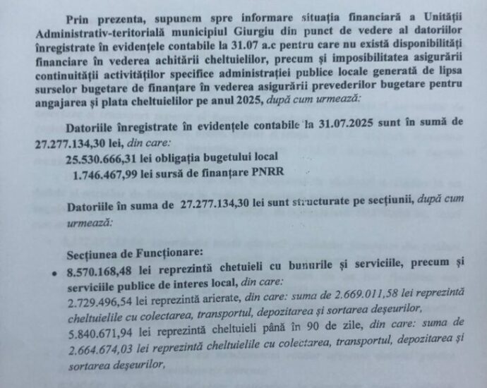 Primarul Adrian Anghelescu a declarat miercuri că municipiul Giurgiu se află printre cele 75% dintre localităţile din ţară care nu îşi pot asigura cheltuielile de funcţionare. „Din anul 2021 vă spuneam de starea economico-financiară a Primăriei Giurgiu, care era una de insolvenţă sau de faliment. (…) Cu părere de răuCiteste pe larg