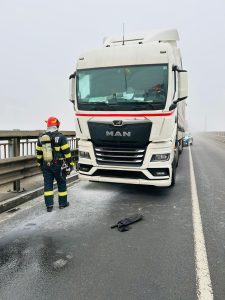 Circulația pe Podul Giurgiu-Ruse este îngreunată pe sensul de mers România- Bulgaria, până la eliberarea carosabilului, după ce un TIR a lut foc.